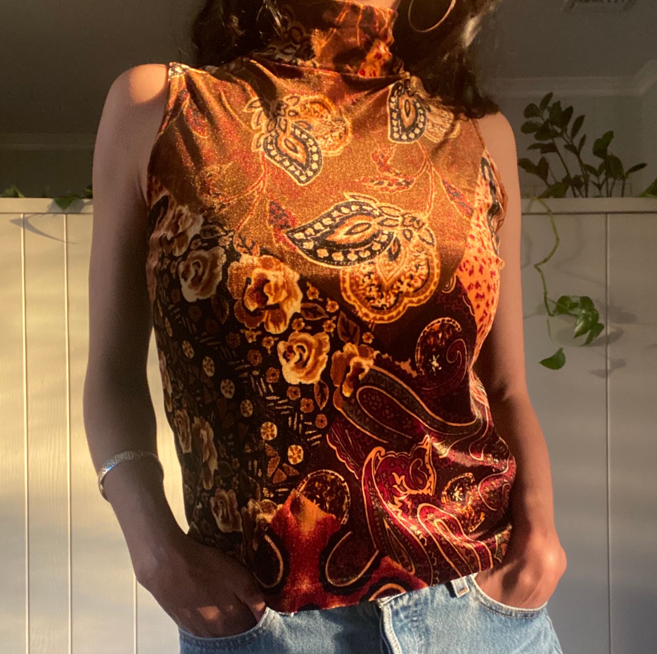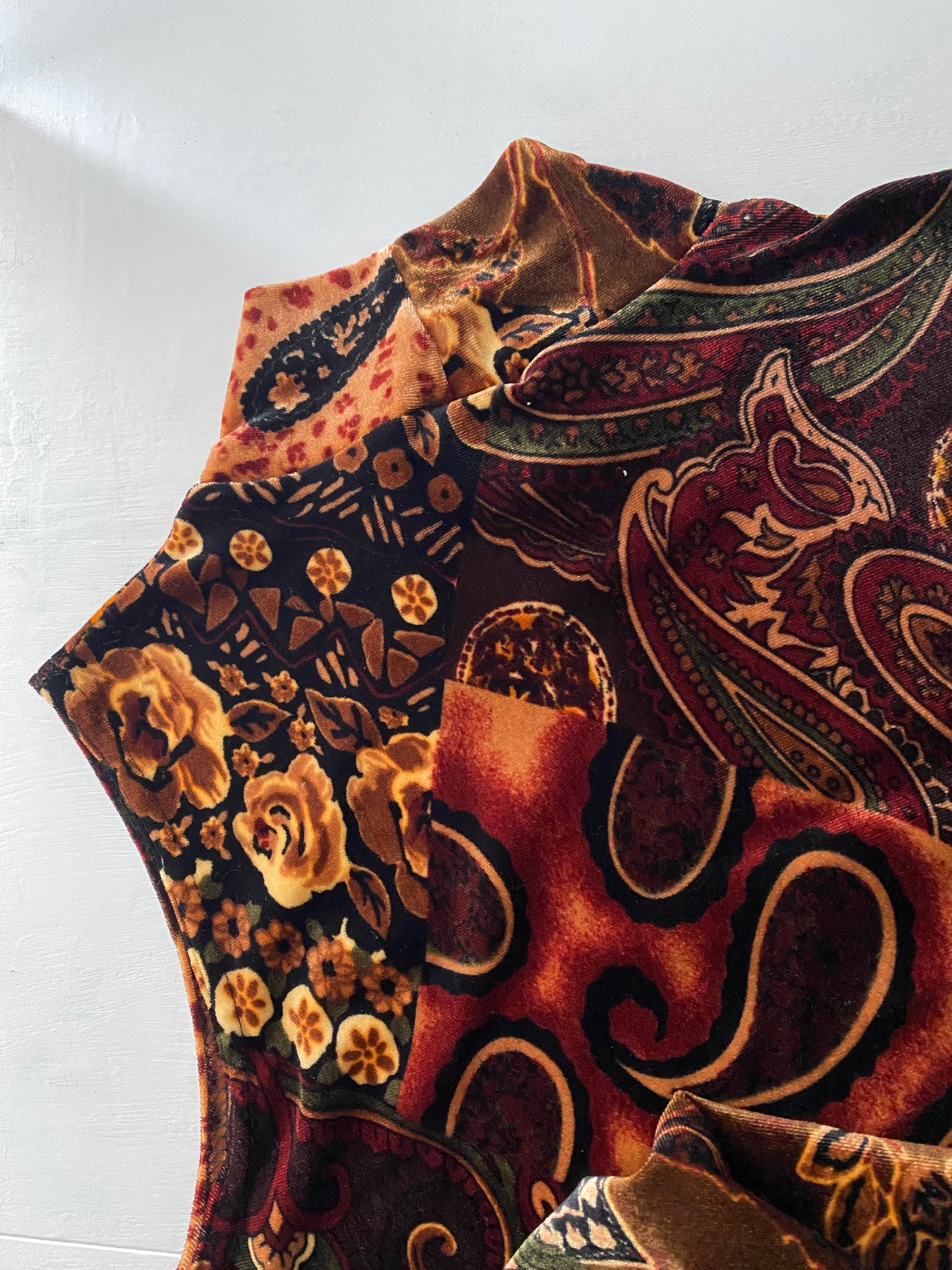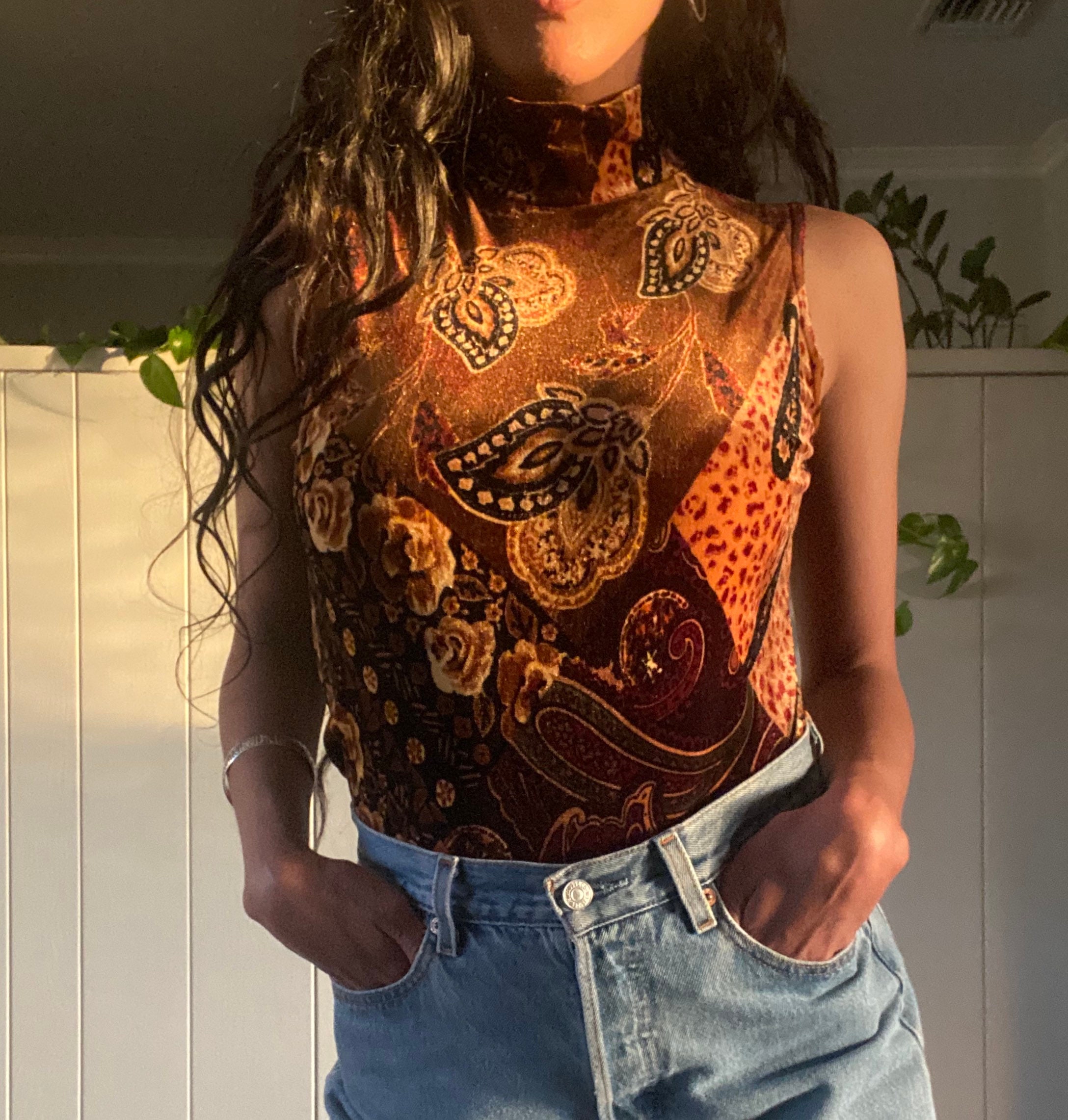 90's vintage bronze brown multicolored velvety turtleneck tank with unique floral design.