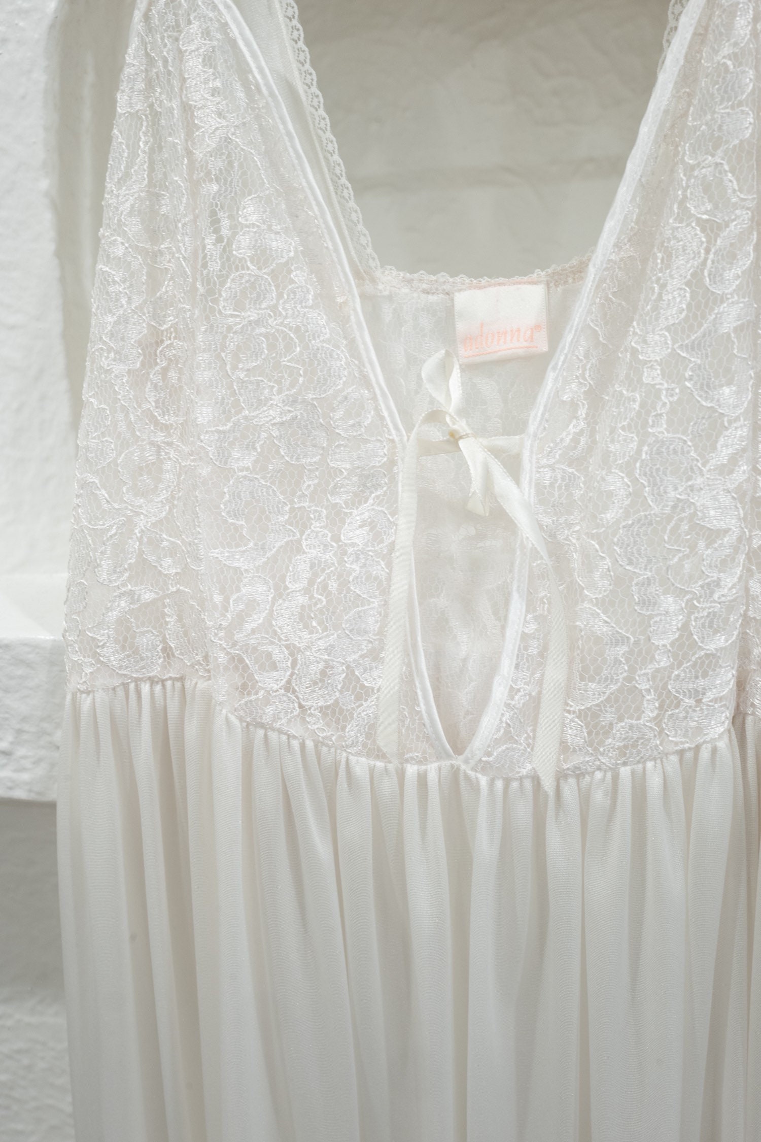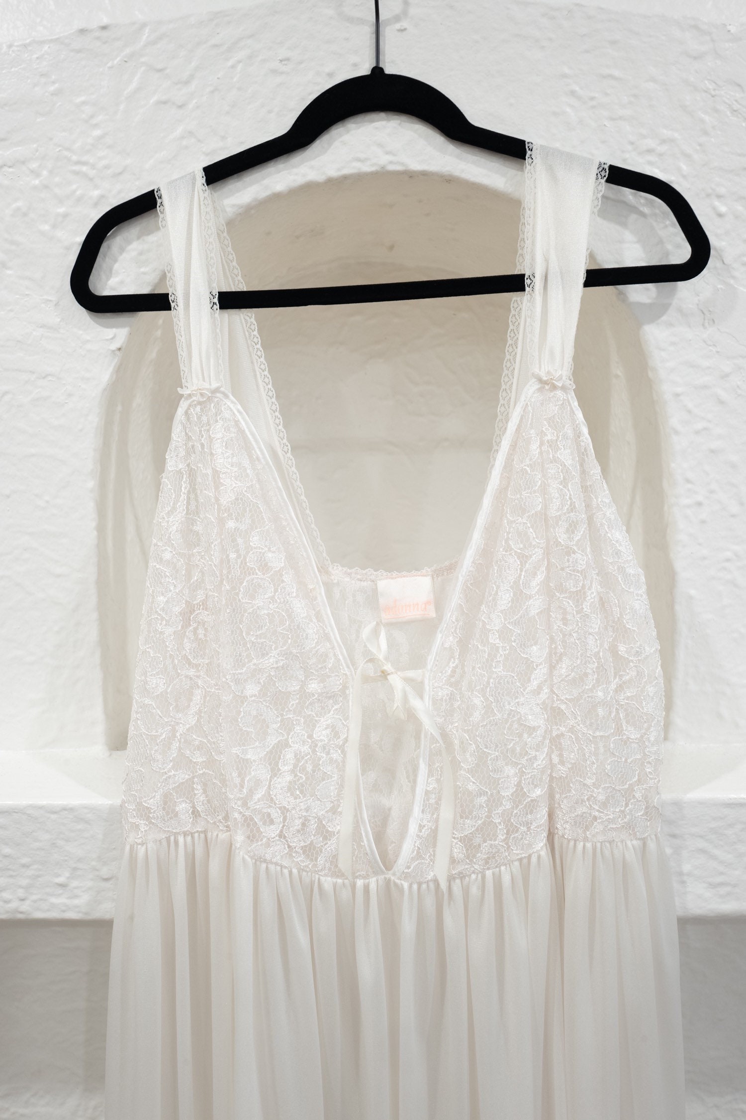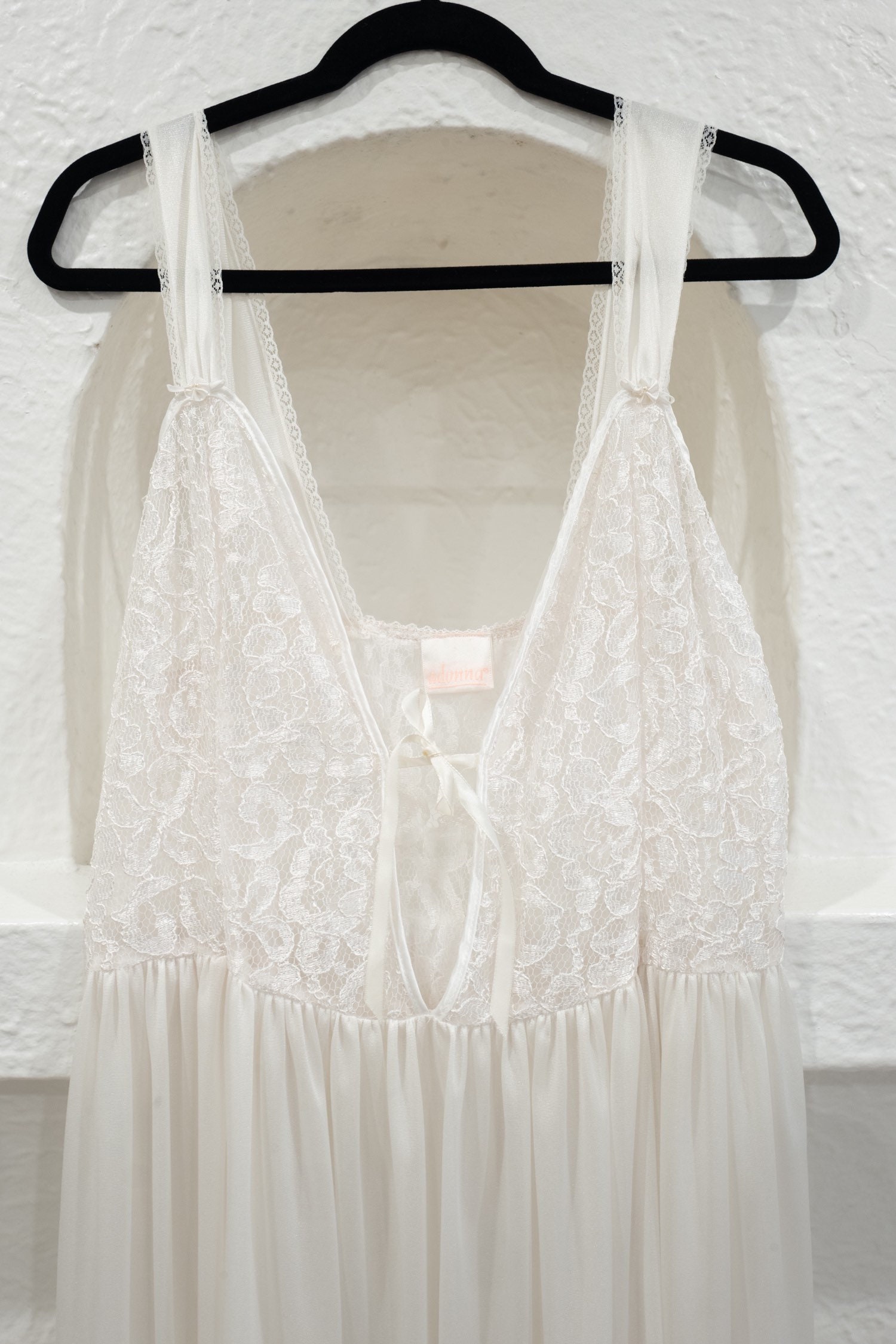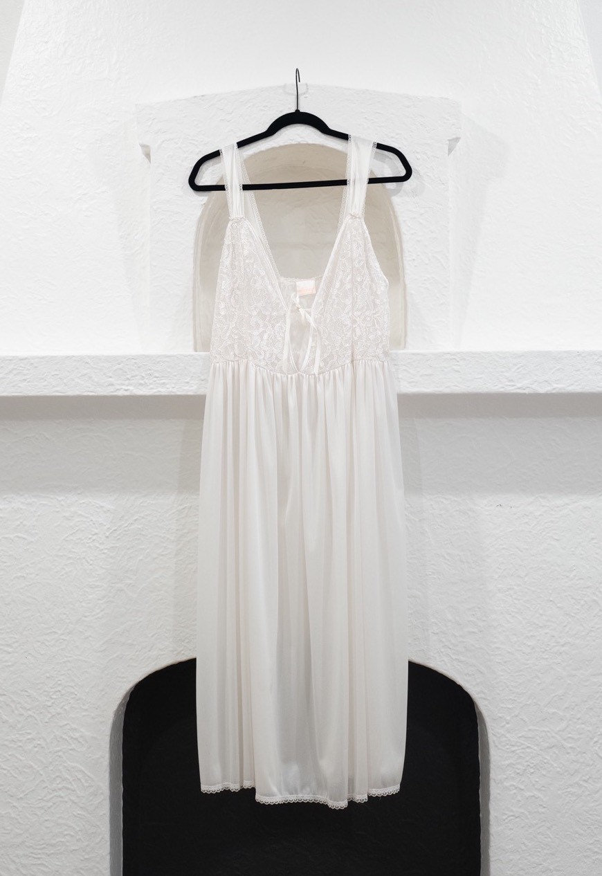 Vintage sheer white and lace night gown. Features deep v neck with ribbon tie at the top for optional closure.