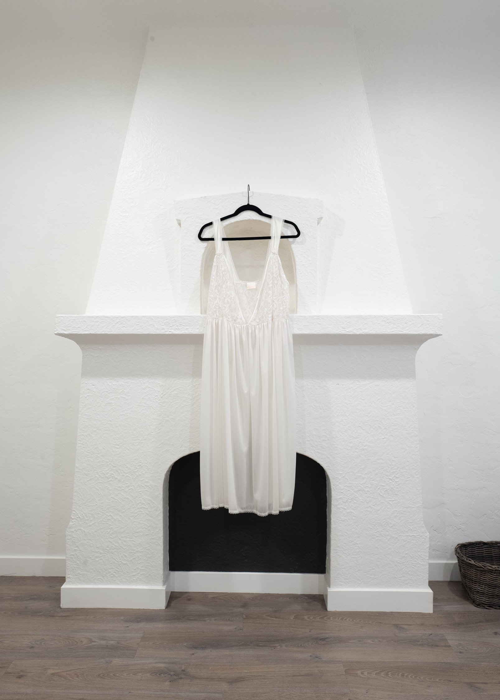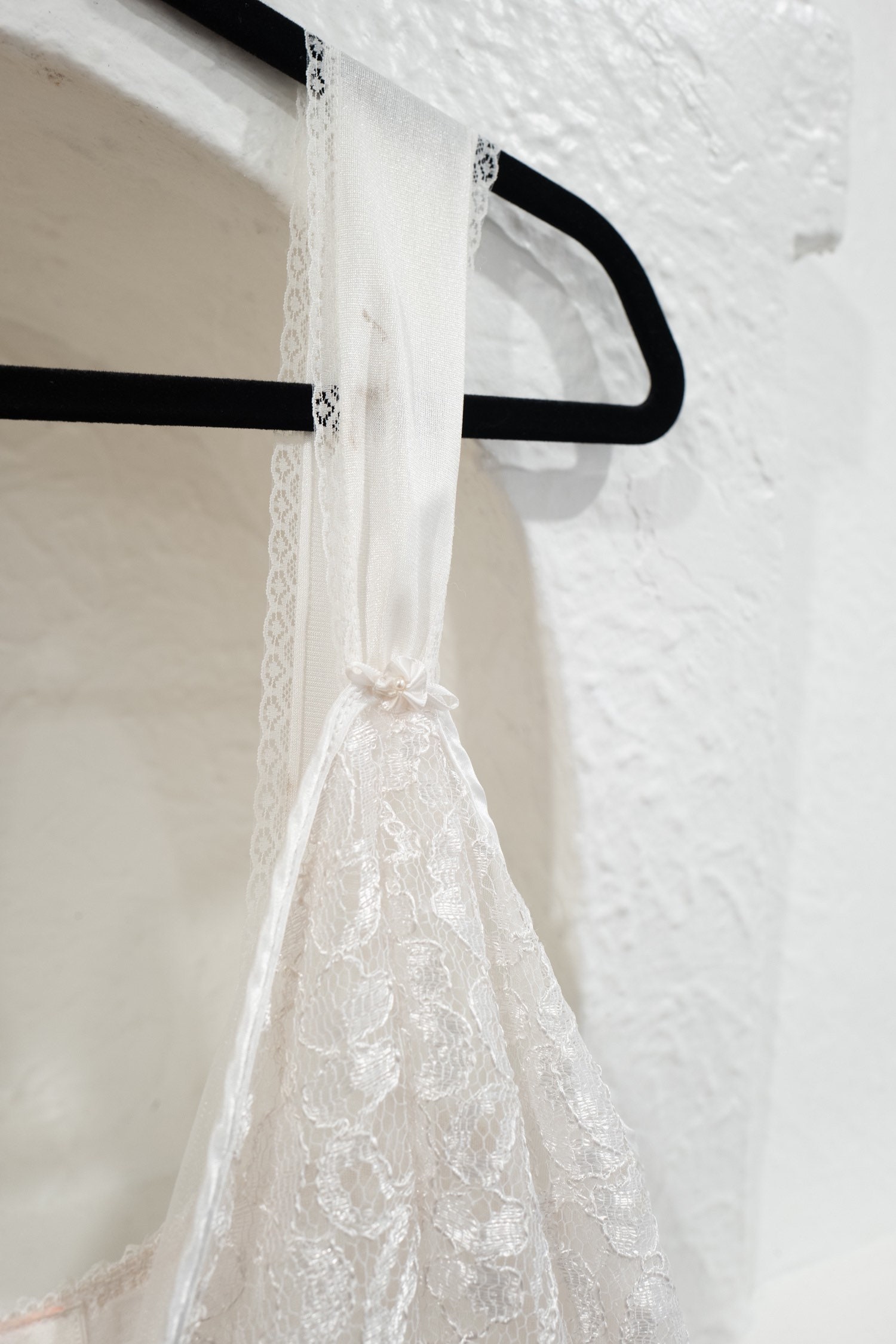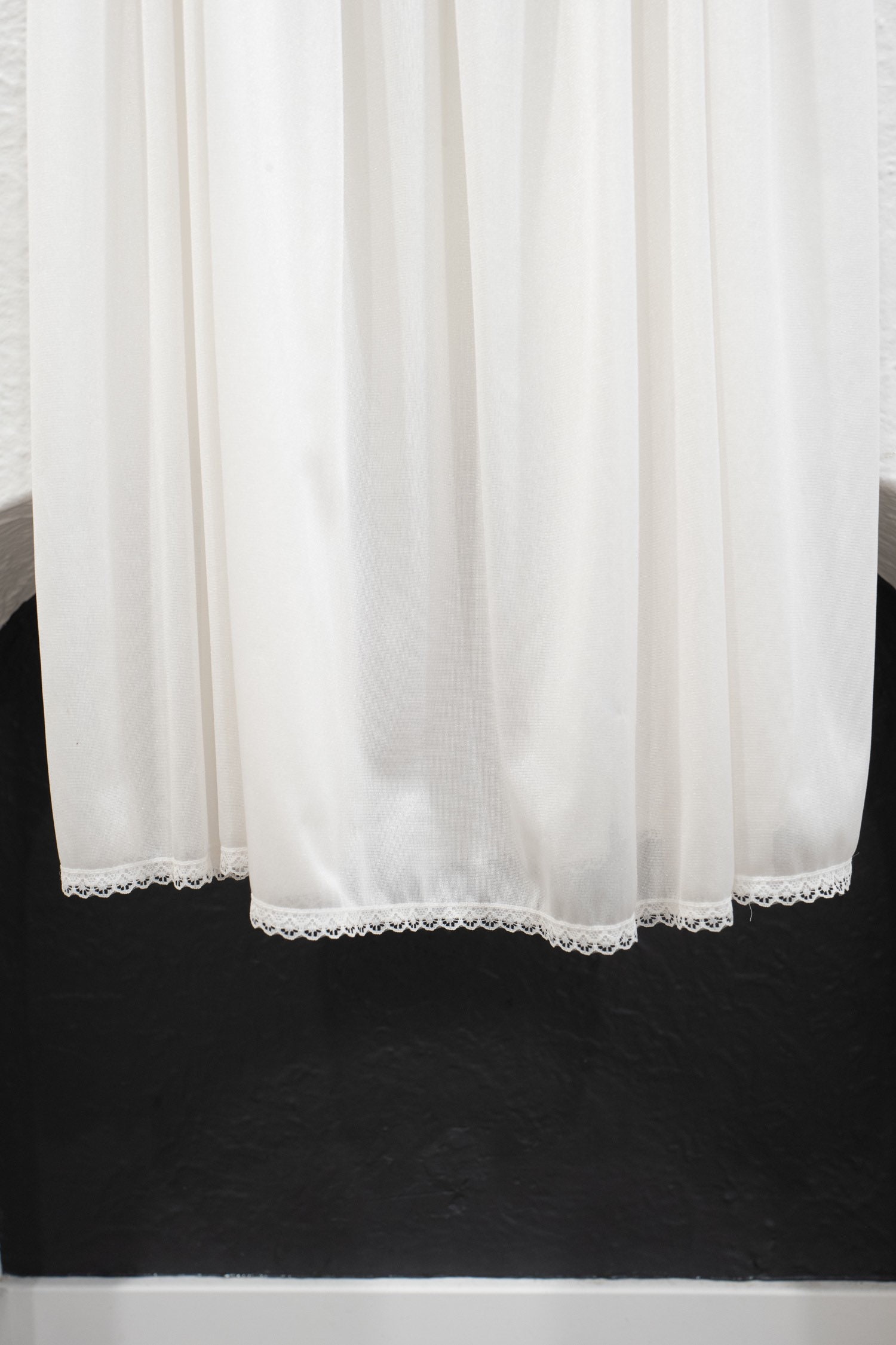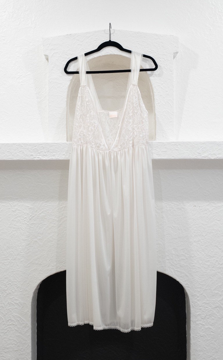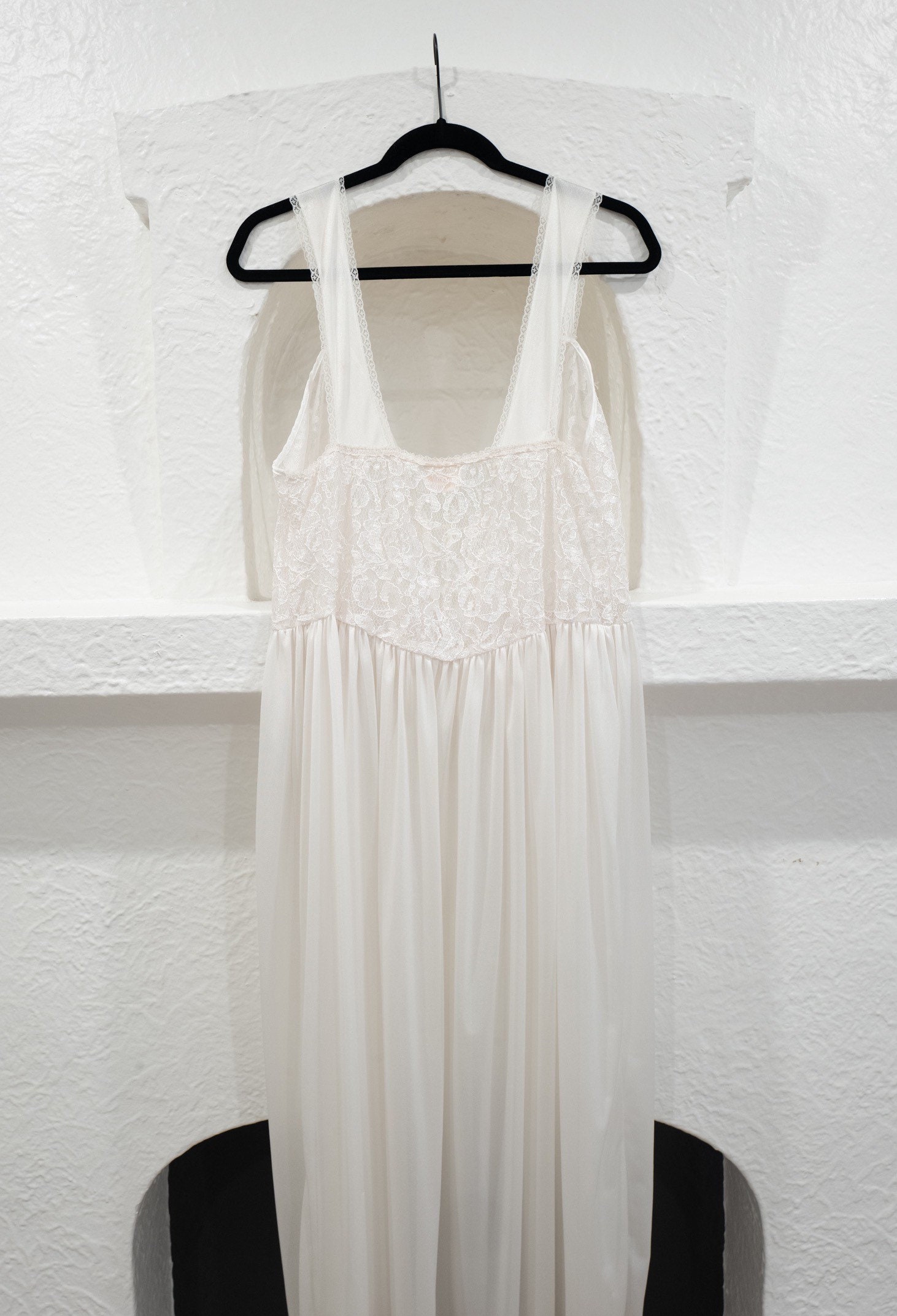 Vintage sheer white and lace night gown. Features deep v neck with ribbon tie at the top for optional closure.