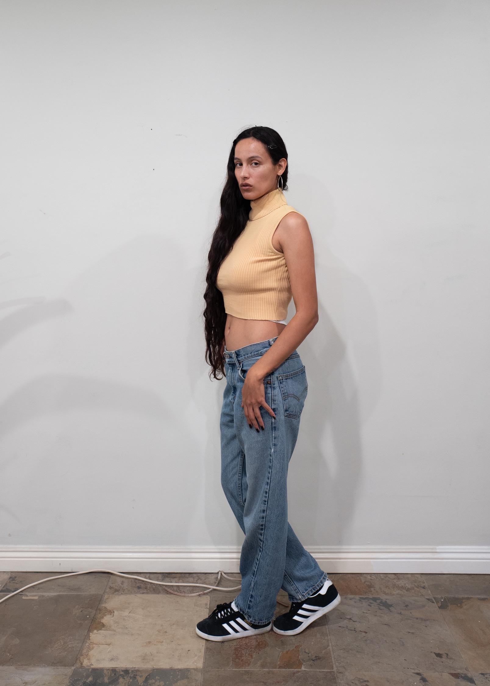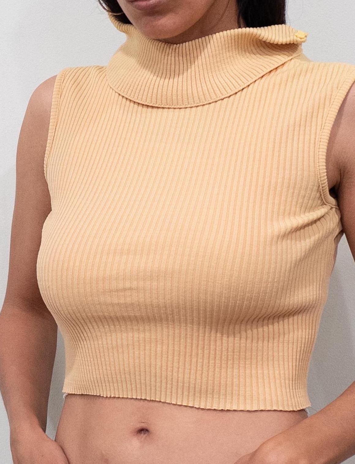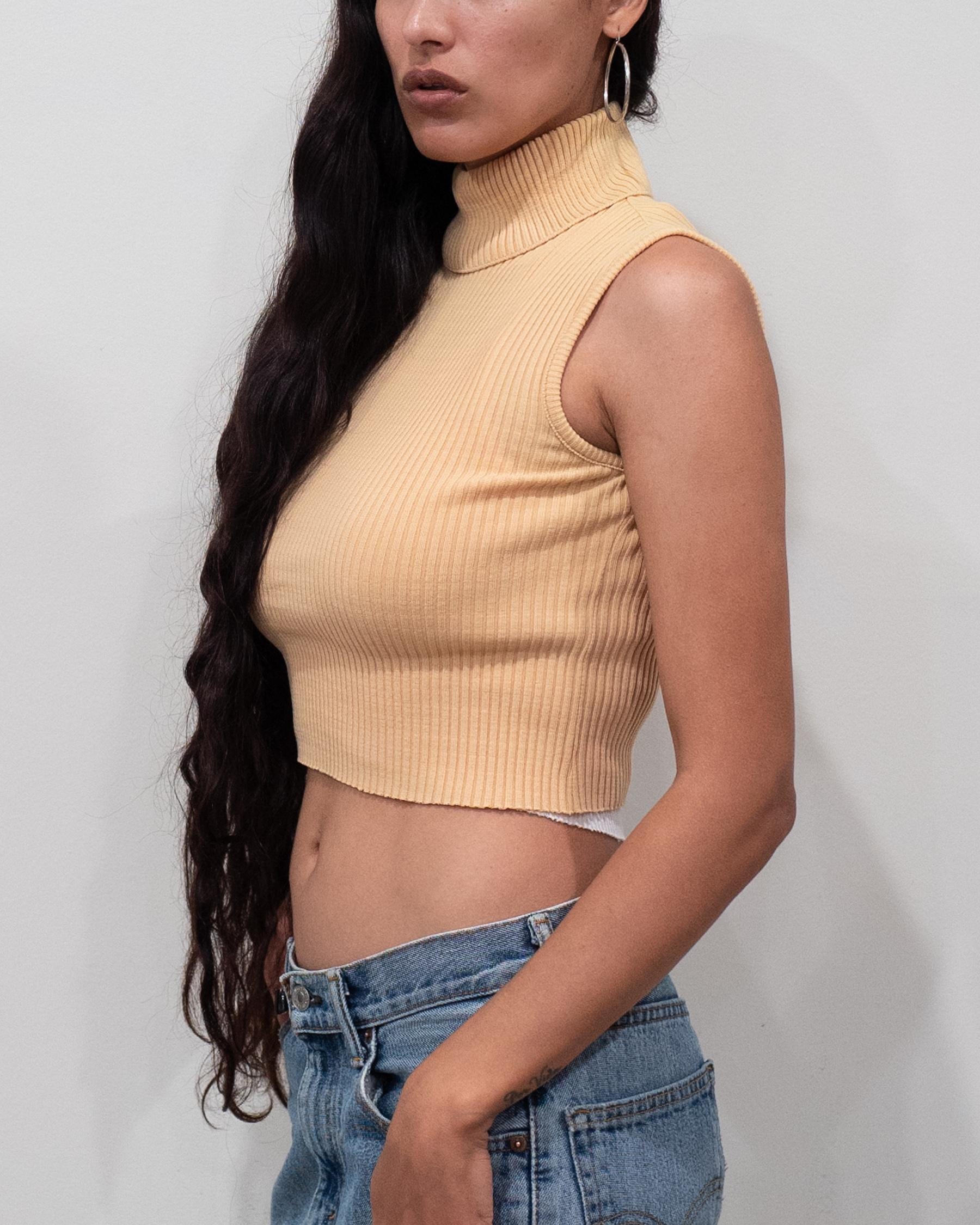 1/1 reworked 1960’s vintage turtleneck tank in a ribbed stretchy soft yellow material