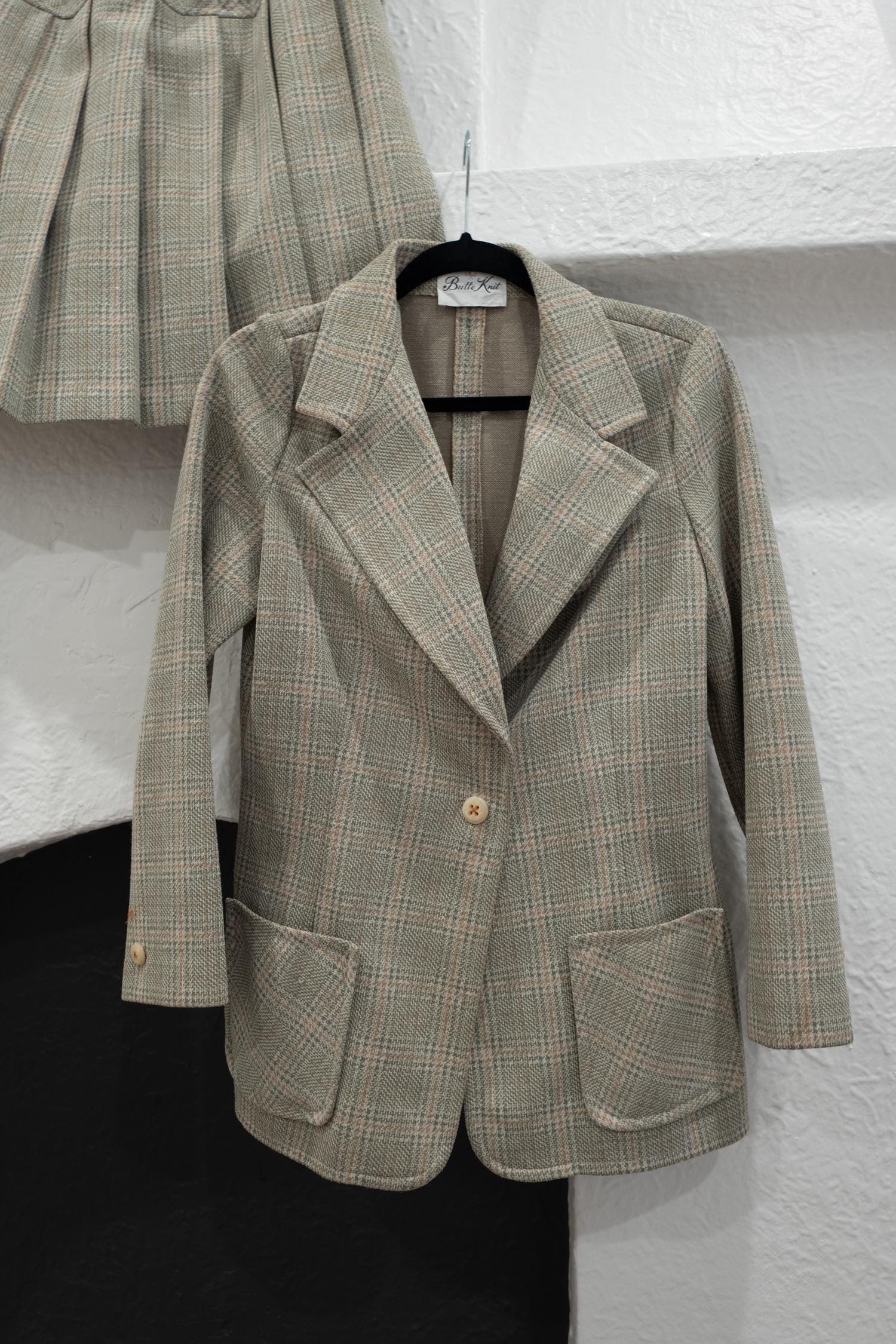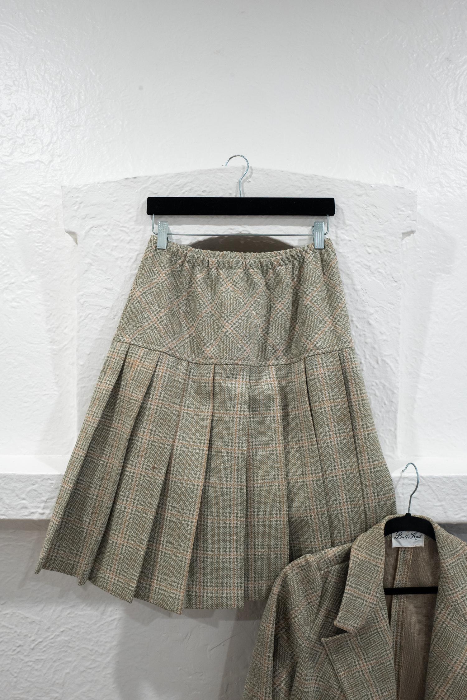 1/1 1960’s Butte Knit pleated skirt and jacket two-piece set in a jade green plaid with cream and a bit of rust orange. Butter yellow buttons on Jacket. Skirt has a stretchy elastic waist.