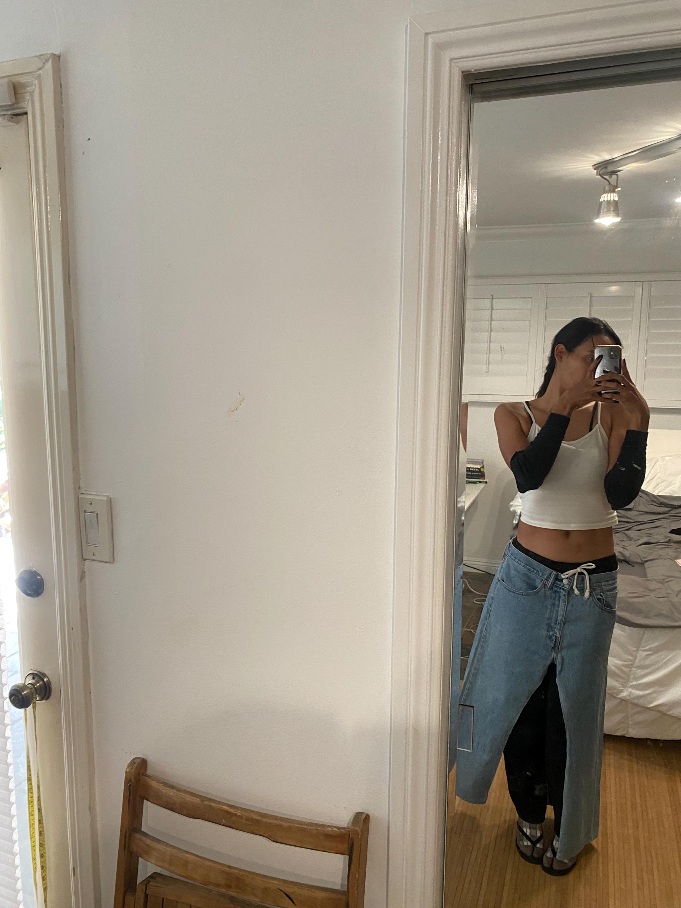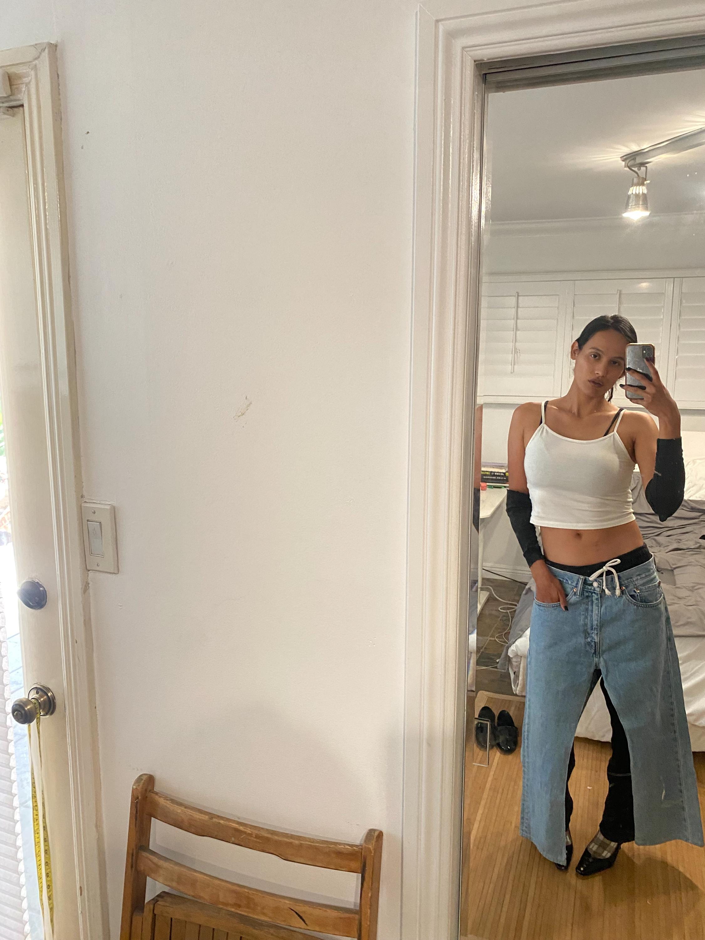 Men’s Levi’s reworked into a 1/1 long denim skirt with high slits. Made to be worn 2 ways - with slits at sides or to front and back as pictured for a different look.